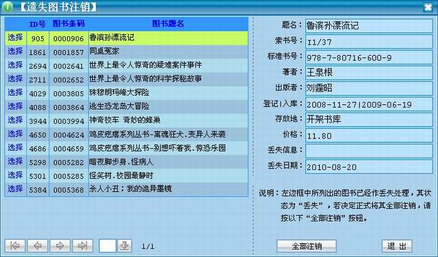 打开此功能后,系统会显示所有的被标志为“丢失”的图书,假如其实要注销,则按“全部注销”按钮即可。